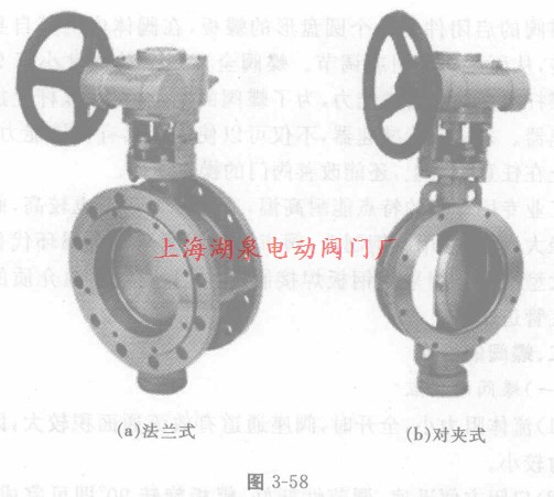 蝶閥根據(jù)連接方式分為:法蘭式、對(duì)夾式,如圖3—58(a)和(b)所示;根據(jù)密封面材料分為:軟密封、硬密封;根據(jù)蝶板在閥體中的安裝方式,蝶閥可分成:板式、斜板式、偏置板式、杠桿式。如圖3-59所示。